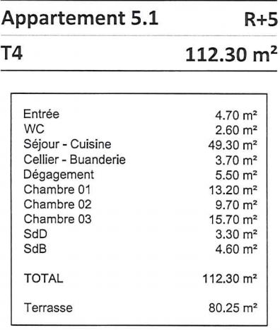Cet appartement neuf de 112 m2 est situé au 5ème étage, avec ascenseur, et est exposé Sud-Ouest.